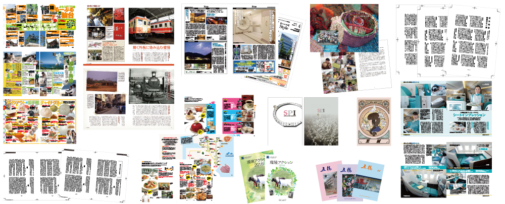プラカーシャ(日本アーユルヴェータ学会ニュースレター)入会案内書(Yogacco)泉区民ふるさとまつりポスター&パンフレット、季刊誌、道の駅レストランメニュー、銀行リーフレット、和食レストランメニュー、農政連加入案内書、環境保全米通信、外資系保険代理店レターヘッド、HotPepperフリー広告(リクルート)、キーマンズネット(リクルート)、タウンワーク関東版・関西版・東海版(リクルート)、仙台市立中学校文集等、私立中学校・高等学校文集等、国立研究機関論文集等、個人出版物装丁等、ゆこゆこ東北版(ゆこゆこ)車情報誌goo東北版(プロトコーポレーション)、るるぶシリーズ、山崎製パン社内報(ヤマザキ)、金哲彦の体幹ランニング(講談社)、まっぷるマガジンベストプランシリーズ(昭文社)、まっぷるマガジンエリア版シリーズ(昭文社)、サーベイシリーズ(昭文社)、ことりっぷシリーズ(昭文社)、キャンピングガイド(昭文社)、お手軽アウトドア(昭文社)、アスクルカタログ(アスクル)、日本代表SPIRITS(ネコパブリシング)、CG WORLD(ワークスコーポレーション)、デジタルチョイス(エンターブレイン)、HOME PC日本版(デジット)、サイエンスアイシリーズ(ソフトバンク)、PC Japan(ソフトバンク)、デジタルフォト(ソフトバンク)、ケータイベスト(ソフトバンク)、Network Guide(ソフトバンク)、デジタルフォト(ソフトバンク)、i phone4 Startbook(ソフトバンク)、i Phone4 Perfect Guide(ソフトバンク)、i Pad perfect guide(ソフトバンク)、公募ガイド(公募ガイド社)、ゲームマニュアル本各種(集英社)、ゲームマニュアル本各種(アスキー)、LIFE SAVER(日本実業出版社)、PubMed活用マニュアル(南江堂)、仙台国際ハーフマラソンガイドブック、町内会30周年記念誌 他(順不同)